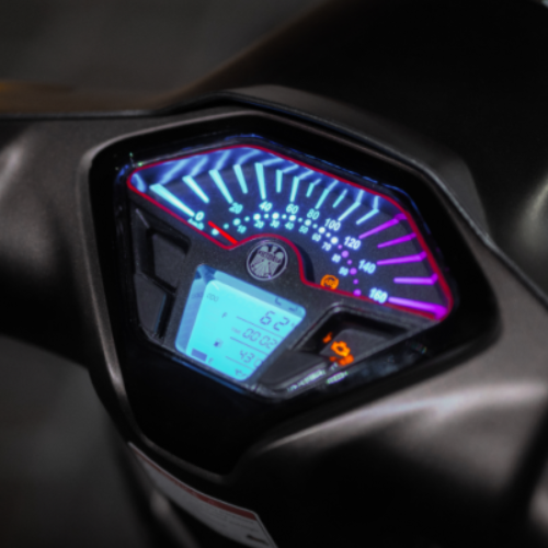 The design-forward cockpit blends the digital display with the colored speedometer to see all your stats at a glance.
