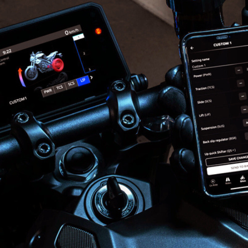 The Yamaha Ride Control (YRC) offers three preset riding modes-SPORT, STREET, and RAIN-plus two customizable options for engine power and electronic intervention, all adjustable via the TFT screen or through the Y-CONNECT app.
